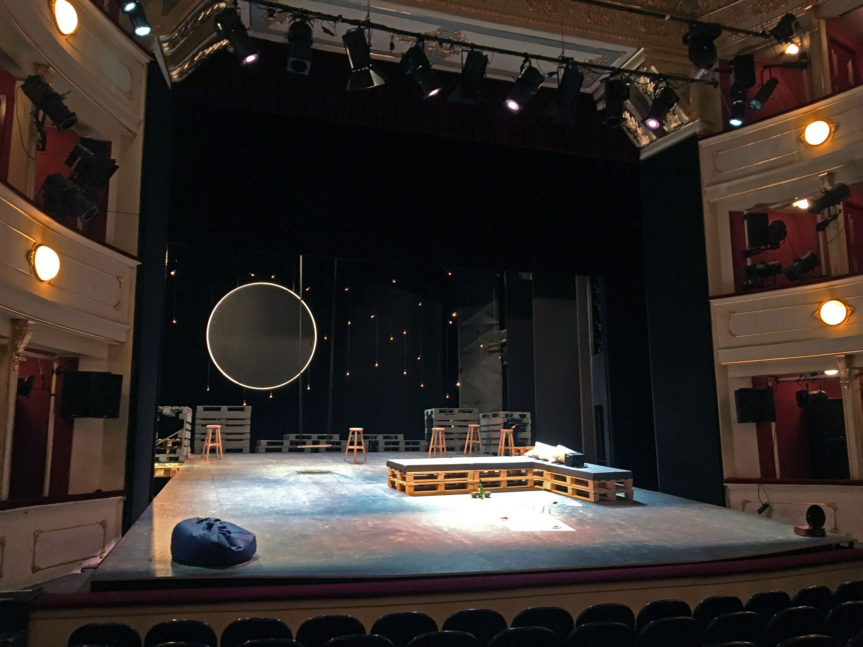 Through a skilful direction of the performance, the film editing of the original is replaced with dynamic mise-en-scènes and the arrangement of different acting areas along the stage’s depth. Thus, the initially united group of friends is scattered around the entire stage area, which emphasises the atmosphere of withdrawal, isolation, frustration and disappointment. For this purpose, an open, minimalist space with individual ambient emphases was designed. The bulbs hanging in the background illustrate a starry sky and create the impression of an infinite horizon, while a big moon in the sky represents the presence of the supernatural, with the animation of the growing moon corresponding to the increasing dramatic tension and the characters losing control over the happening.